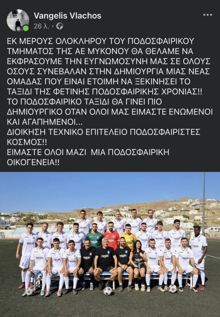«Εκ μέρους ολόκληρου του ποδοσφαιρικού τμήματος της ΑΕ Μυκόνου θα θέλαμε να εκφράσουμε την ευγνωμοσύνη μας σε όλους όσους συνέβαλαν στην δημιουργία μιας νέας ομάδας που είναι έτοιμη να ξεκινήσει το ταξίδι της φετινής ποδοσφαιρικής χρονιάς!», αναφέρει χαρακτηριστικά στην ανάρτησή του.