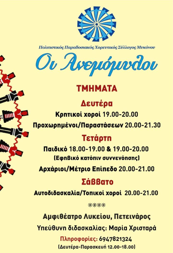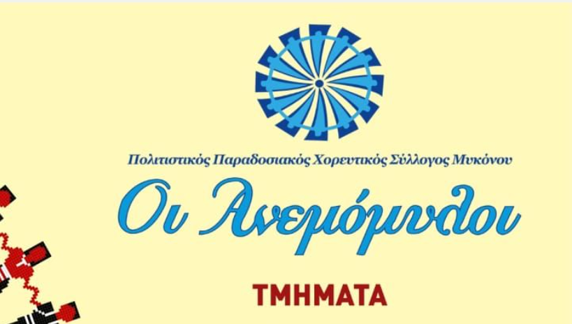 Ο Πολιτιστικός Παραδοσιακός Χορευτικός Σύλλογος Μυκόνου «Οι Ανεμόμυλοι» υποδέχεται και πάλι τους λάτρεις του χορού, σηματοδοτώντας την έναρξη της νέας χορευτικής περιόδου την Τρίτη 10 Σεπτεμβρίου.